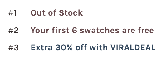 | 3 | productType is 'Swatch Book' | "Your First Swatch Book is Free" |