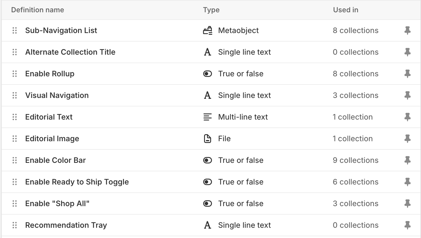 This document outlines the configuration options available for Shopify product listing pages (PLP), aka collection pages, allowing customization of page layout and functionality.