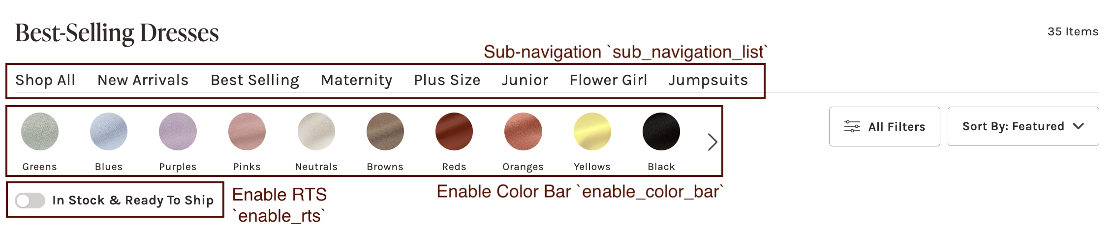 - Function: When enabled, a color bar will display on: the left of the filter/sort menus on desktop; underneath the filter/sort menus on mobile. Each of the color bubbles will open a modal that will toggle to the color family filters. Clicking on a specific color bubble will automatically scroll to the color family and open the accordion to display color filters.